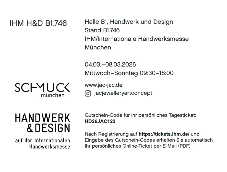 JAC JEWELLERY ART CONCEPT ist eine Gruppe von derzeit elf selbständigen Schmuckkünstlerinnen und Schmuckkünstlern. Die unterschiedlichen Biografien der Mitglieder ergänzen sich zu einer spannenden Dynamik. Gemeinsame Auftritte führen in Galerien, Museen und seit mehreren Jahren an die Internationale Handwerksmesse München.